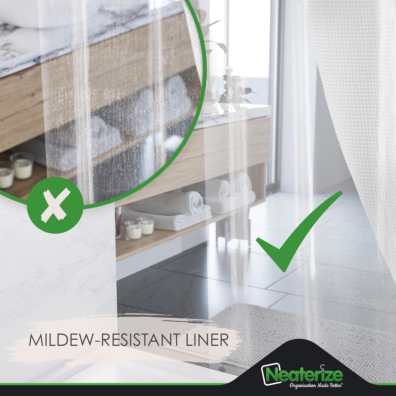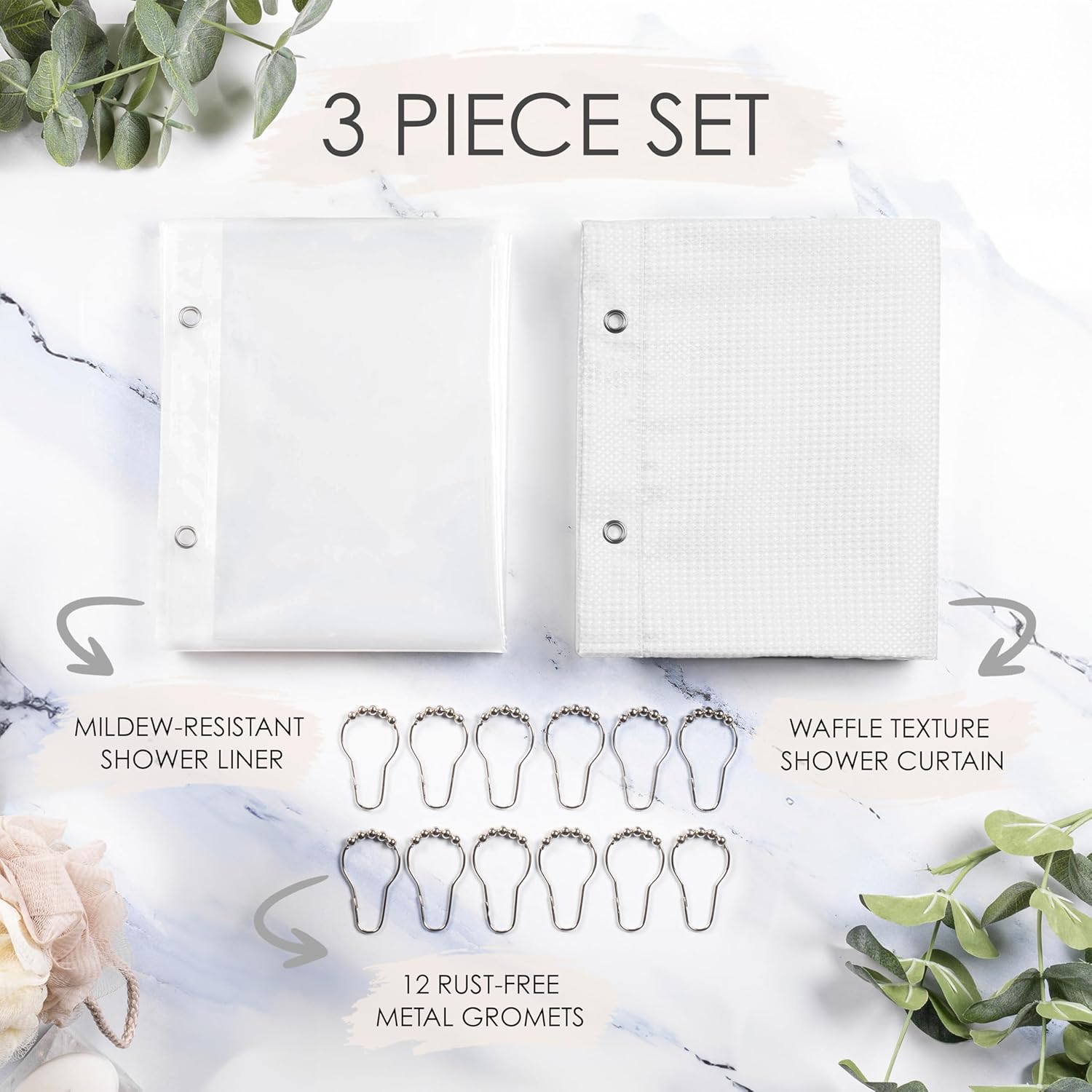 3 in 1 Shower Curtain Set – 72×72 White Shower Curtain Fabric and Shower Curtain Liner with Rust-Resistant Metal Hooks – Bathroom Shower Curtain Sets – Cortinas de Baño